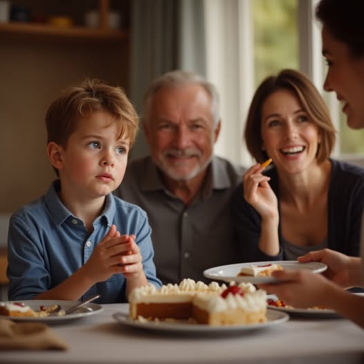 Лиза сидела, подперев щёку рукой. В комнате было шумно, жарко. Она смотрела, как другие дети едят: крошки на щеках, крем на пальцах. Рядом с ней стояла пустая тарелка.