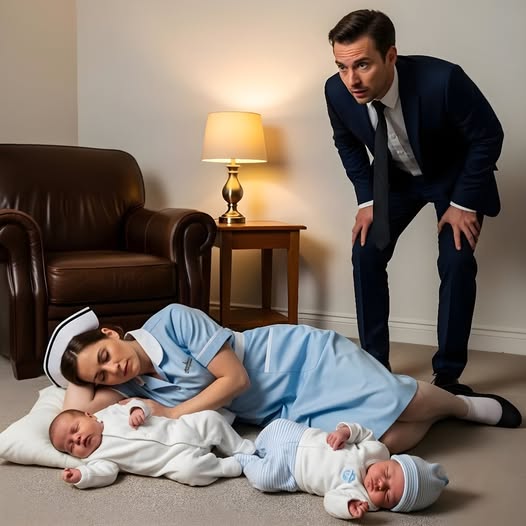 Под мягким светом лампы на полу спала девушка в бирюзовой униформе уборщицы. Её голова покоилась на сложенном полотенце, а длинные тёмные ресницы касались щёк в глубоком сне. Крепко прижав к себе два её крохи — сыновей Этана — малыши, укутанные в нежные одеяла, сжали её руки, словно ища защиту и тепло.