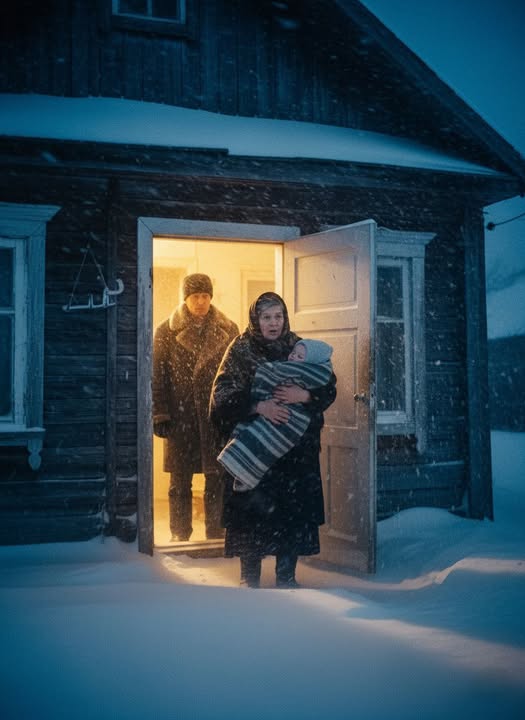 Дверь открылась с трудом — её почти замело снегом. На пороге стояла девушка, хрупкая, как тростник, в элегантном тёмном пальто. В руках она держала свёрток. Лицо её было заплакано, глаза расширены от страха.